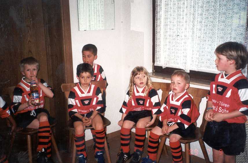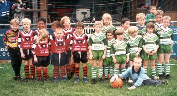 Kleinsten des FC Von links: Enrico Esposito, Michael Tögel, Rezwan Haque, Alexander Seehöfer, Christian Jäger; davor: Angelina Esposito, Christian Seehöfer, Toni Romano; ganz vorne rechts: Pascal Blankart |